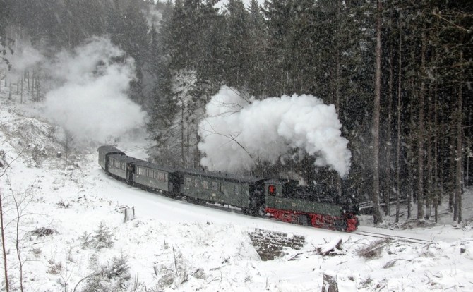 Bild oben: Die 99 5902 kämpft sich durch den Schnee. Copyright: Joachim Bügel / Slg. Eisenbahnstiftung