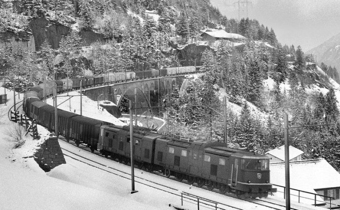 Die 11851 mit einem langen Güterzug am Gotthard. © SLM Werksfoto / Slg. Eisenbahnstiftung